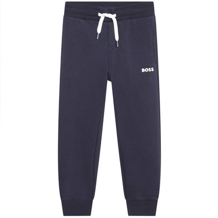 - Boys navy tracksuit pants with white Boss logo. Cotton fleece track trousers, elasticated waist with drawstring, front pockets, side bottom yokes with "BOSS" print.