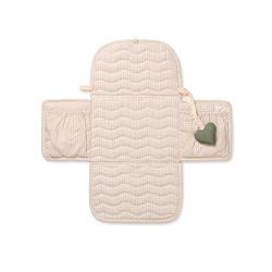 Stylowy i funkcjonalny, niezbędny element wyposażenia dla rodzin w ciągłym ruchu. Lekki i praktyczny, łatwo się składa i wiąże małą wstążeczką. Prosty, ale przemyślany design, z dwiema kieszeniami na pieluszki, ubranka i drobiazgi – wszystko pod ręką. Dołączona jest słodka zabawka w kształcie serduszka, która zapewnia maluchom komfort podczas przewijania.