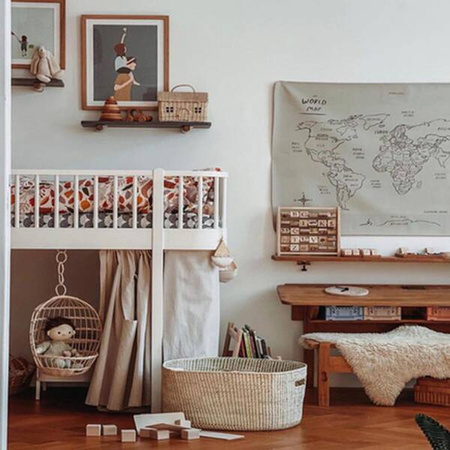 Do łóżka można dodatkowo dokupić materac oraz kurtynę dzięki której mebel zyskuje dodatkową funkcjonalność - nietuzinkowy plac zabaw. Zaokrąglone krawędzie mebla sprawiają, że cała konstrukcja wygląda na lekką. Połączenie brzozowego drewna z dębowymi wstawkami sprawia, że mebel jest elementem dekoracyjnym pokoiku dziecięcego.