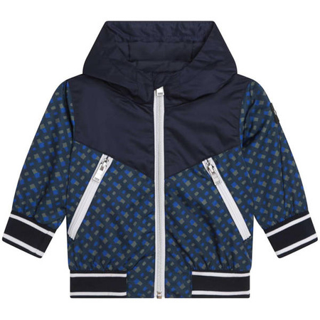 Kurtka dziecięca dla chłopięca z kapturem z nadrukiem monogramu z kolekcji BOSS. Kurtka zapinana na suwak. Rękawy wykończone ściągaczem. Z przodu dwie kieszenie zapinane na suwak. Na lewym rekawie skórzane logo.